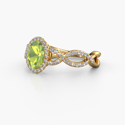 This 14 Carat gold ring is called Dionne ovl and is set with 7x5 mm peridot. This exclusive gold pavé solitaire engagement ring is a true work of art! The ornaments are crafted with a lot of patience and great passion. In order to create this ring with great precision, this craft requires a keen eye and skillful hand. A challenge which ignites a fire in our expert goldsmith. The exquisite peridot are set in a special way so they stand out even more. This gives the ring an even more glamorous appearance. The twisted engagement ring is actually unique on its own because of the gemstones which we carefully select especially for this ring. On top of that you select the precious metals which will be used to create a unique ring for the most extraordinary woman in your life! This jewel is unique in every way! Simply customize to your likingAfter receiving your order, our goldsmiths will start the creative process of making your Dionne ovl engagement ring. We don't keep stock. This is advantageous because these costs will not be passed on to you. Therefore, we can offer jewelry at exceptionally low prices.Different styles of new rings are made daily by our team. Perhaps you have found a pavé solitaire engagement ring somewhere. One you would like to give to your loved one. Please feel free to share your thoughts and design with our jewel designers. We would love to turn your design into a exclusive engagement ring. You can follow the development of your ring design because we use very detailed 3D drawings. On top of that, you can order a dummy of the design. A dummy is a plastic ring, which can be shaped according your ring design. You can try it on and check if the engagement ring is up to standard. We will gladly send you a non-binding offer, based on a fair price/ quality ratio. The offer will baffle you, considering the quality of the ring and gemstones.To make it easier for you, we offer a 30 day return policy. Check our terms and conditions.
