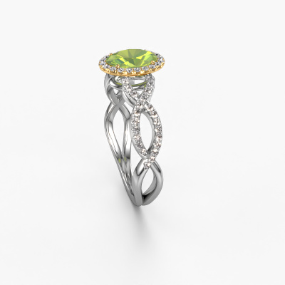 This 14 Carat white gold ring is called Dionne ovl and is set with 7x5 mm peridot. This exclusive white gold pavé solitaire engagement ring is a true work of art! The ornaments are crafted with a lot of patience and great passion. In order to create this ring with great precision, this craft requires a keen eye and skillful hand. A challenge which ignites a fire in our expert goldsmith. The exquisite peridot are set in a special way so they stand out even more. This gives the ring an even more glamorous appearance. The twisted engagement ring is actually unique on its own because of the gemstones which we carefully select especially for this ring. On top of that you select the precious metals which will be used to create a unique ring for the most extraordinary woman in your life! This jewel is unique in every way! Simply customize to your likingAfter receiving your order, our goldsmiths will start the creative process of making your Dionne ovl engagement ring. We don't keep stock. This is advantageous because these costs will not be passed on to you. Therefore, we can offer jewelry at exceptionally low prices.Different styles of new rings are made daily by our team. Perhaps you have found a pavé solitaire engagement ring somewhere. One you would like to give to your loved one. Please feel free to share your thoughts and design with our jewel designers. We would love to turn your design into a exclusive engagement ring. You can follow the development of your ring design because we use very detailed 3D drawings. On top of that, you can order a dummy of the design. A dummy is a plastic ring, which can be shaped according your ring design. You can try it on and check if the engagement ring is up to standard. We will gladly send you a non-binding offer, based on a fair price/ quality ratio. The offer will baffle you, considering the quality of the ring and gemstones.To make it easier for you, we offer a 30 day return policy. Check our terms and conditions.