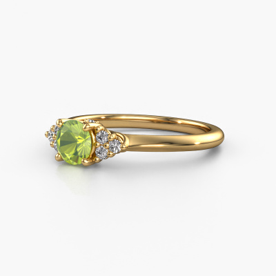 This 14 Carat gold ring is called Felipa RND and is set with 5 mm peridot. What is it that makes your relationship unique? What is it about her that makes you want to bend down on one knee? The unique bond between the two of you is emphasized by an equally unique ring. A one of a kind ajour 3-stone engagement ring made especially for her. That is why this fantasy ring fits her like a glove. Each specific detail of this ajour gold peridot set engagement ring is hand-picked, crafted and polished by our expert goldsmith. The result is an exquisite ring, unique and perfectly crafted to perfection. That is what our expert Goldsmiths strive for. This jewel is made just for you by our master goldsmiths in our own studio.After receiving your order, our goldsmiths will passionately start the creative process of making your engagement ring in our own studio. Because we don't have a big stockpile, these costs will not be passed on to you. Our pricing is proof of that! We offer top quality jewels at lowest price, guaranteed.Have you found a specific engagement ring somewhere which you would like to give to your loved one? Please feel free to express your wishes to our jewel designers because we would be honored to turn your design into a fantasy engagement ring. You can follow the development of your ring design because we use 3D drawings. This gives you a realistic preview of how your design will look. You can also preorder a dummy. A dummy is a plastic ring, which can be shaped according your ring design. You can try it on and check if its width and size are suitable for you. We will gladly send you a non-binding offer, based on a fair price/ quality ratio. It will amaze you, considering the quality of the ring and gemstones.To make it easier for you, we offer a 30 day return policy. Check our terms and conditions.