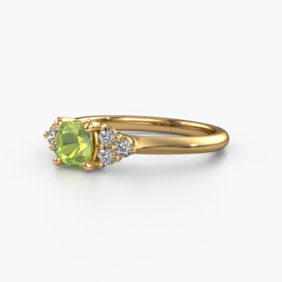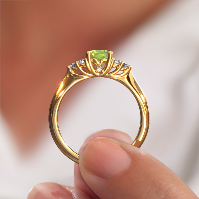 This 14 Carat gold ring is called Felipa CUS and is set with peridot. How would you describe the style of the love of your life? Does she have a unique sense of style? This stunning graceful gold engagement ring can be custom made to your own or her liking. Our peridot gemstones have been carefully selected because we believe your vintage engagement ring must be adorned with nothing but the most beautiful gemstone. Don't you agree? This jewel is made just for you by our master goldsmiths in our own studio.By using our modern techniques, we can design and customize the finest quality jewels with the utmost care for you. Our engagement rings are always priced 30 percent lower than other jewelers. We make engagement rings to order so we don't have to maintain a large stock. If you have a certain budget, we are more than happy to advice you accordingly.Have you found a specific engagement ring somewhere which you would like to give to your loved one? Please feel free to express your wishes to our jewel designers because we would be honored to turn your design into a vintage engagement ring. You can follow the development of your ring design because we use 3D drawings. This gives you a realistic preview of how your design will look. You can also preorder a dummy. A dummy is a plastic ring, which can be shaped according your ring design. You can try it on and check if its width and size are suitable for you. We will gladly send you a non-binding offer, based on a fair price/ quality ratio. It will amaze you, considering the quality of the ring and gemstones.To make it easier for you, we offer a 30 day return policy. Check our terms and conditions.
