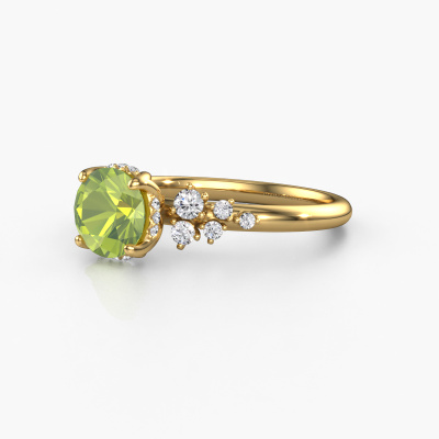 This 14 Carat gold ring is called Emma RND and is set with peridot. How would you describe the style of the love of your life? Does she have a unique sense of style? This stunning refined gold engagement ring can be custom made to your own or her liking. Our peridot gemstones have been carefully selected because we believe your fantasy engagement ring must be adorned with nothing but the most beautiful gemstone. Don't you agree? This jewel is made just for you by our master goldsmiths in our own studio.By using our modern techniques, we can design and customize the finest quality jewels with the utmost care for you. Our engagement rings are always priced 30 percent lower than other jewelers. We make engagement rings to order so we don't have to maintain a large stock. If you have a certain budget, we are more than happy to advice you accordingly.Have you found a specific engagement ring somewhere which you would like to give to your loved one? Please feel free to express your wishes to our jewel designers because we would be honored to turn your design into a fantasy engagement ring. You can follow the development of your ring design because we use 3D drawings. This gives you a realistic preview of how your design will look. You can also preorder a dummy. A dummy is a plastic ring, which can be shaped according your ring design. You can try it on and check if its width and size are suitable for you. We will gladly send you a non-binding offer, based on a fair price/ quality ratio. It will amaze you, considering the quality of the ring and gemstones.To make it easier for you, we offer a 30 day return policy. Check our terms and conditions.