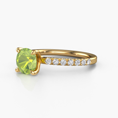 The ring shown above is called the Crystal RND 2. We call this type of ring a pavé solitaire ring because it has one center gemstone and a band that is also pave set with gemstones. The 14 Carat gold engagement ring is set with a round 7 mm peridot center stone and the band is pave set with lab-grown diamond gemstones. Each jewel is unique in every way! Simply customize to your liking,This classic gold pavé solitaire engagement ring has an exquisite round peridot center stone. To further accentuate the center stone, the band is fully set with more lab grown diamonds. Its open prong setting allows light to strike the peridot from various angles and this adds sparkle to your peridot ring. The photo shown above depicts the goldsmith's carefully handcrafted details of the ring. The high positioning of the center stone is truly eye-catching. The perfect engagement ring for the crown jewel of your life! After receiving your order, our goldsmiths will start the creative process of making your Crystal RND 2 engagement ring. We don't keep stock. This is advantageous because these costs will not be passed on to you. Therefore, we can offer jewelry at exceptionally low prices.Different styles of new rings are made daily by our team. Perhaps you have found a pavé solitaire engagement ring somewhere. One you would like to give to your loved one. Please feel free to share your thoughts and design with our jewel designers. We would love to turn your design into a classic engagement ring. You can follow the development of your ring design because we use very detailed 3D drawings. On top of that, you can order a dummy of the design. A dummy is a plastic ring, which can be shaped according your ring design. You can try it on and check if the engagement ring is up to standard. We will gladly send you a non-binding offer, based on a fair price/ quality ratio. The offer will baffle you, considering the quality of the ring and gemstones.To make it easier for you, we offer a 30 day return policy. Check our terms and conditions.