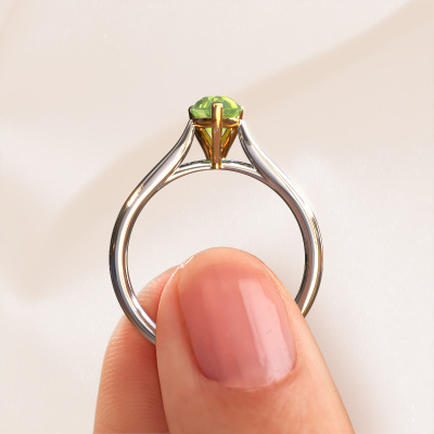 The ring shown above is called the Mignon per 1, we call this a solitaire ring because it contains a single gemstone. The engagement ring is made in 14 Carat white gold and has a pear peridot of 7x5 mm. The cool thing about our configurator is that you can compile your own piece of jewelry, into a completely personalized one. This solitaire ring is crafted in the precious metals white gold with gold, but of course you are free to pick your own colors. Each piece of jewelry is created to add sparkle to your finger, each jewel is lovingly made by hand by our goldsmiths.The solitaire ring is a special type of engagement ring. Its open prong setting allows light to strike the gemstone from various angles. This classic engagement ring is a stunning eye-catcher because of the high positioning of the gemstone. In order for you to commemorate your proposal with a unique ring, we carefully adorn this solitaire ring by hand. The love of your life deserves nothing but the best. After receiving your order, our goldsmiths will start the creative process of making your Mignon per 1 engagement ring. We don't keep stock. This is advantageous because these costs will not be passed on to you. Therefore, we can offer jewelry at exceptionally low prices.Our team adds new designs to our online collection daily. Our designers and goldsmiths work together in creating the best design. We strive to offer a diverse collection of jewels. Perhaps you have a specific jewel design in mind. One you came across somewhere. Please contact us for a free consultation. We will make you an offer, based on a fair price/ quality ratio, that will baffle you.To make it easier for you, we offer a 30 day return policy. Check our terms and conditions.