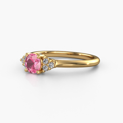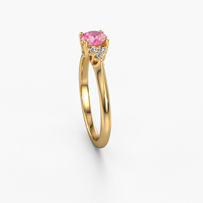 This 14 Carat gold ring is called Felipa RND and is set with 5 mm pink sapphire. What is it that makes your relationship unique? What is it about her that makes you want to bend down on one knee? The unique bond between the two of you is emphasized by an equally unique ring. A one of a kind ajour 3-stone engagement ring made especially for her. That is why this fantasy ring fits her like a glove. Each specific detail of this ajour gold pink sapphire set engagement ring is hand-picked, crafted and polished by our expert goldsmith. The result is an exquisite ring, unique and perfectly crafted to perfection. That is what our expert Goldsmiths strive for. This jewel is made just for you by our master goldsmiths in our own studio.After receiving your order, our goldsmiths will passionately start the creative process of making your engagement ring in our own studio. Because we don't have a big stockpile, these costs will not be passed on to you. Our pricing is proof of that! We offer top quality jewels at lowest price, guaranteed.Have you found a specific engagement ring somewhere which you would like to give to your loved one? Please feel free to express your wishes to our jewel designers because we would be honored to turn your design into a fantasy engagement ring. You can follow the development of your ring design because we use 3D drawings. This gives you a realistic preview of how your design will look. You can also preorder a dummy. A dummy is a plastic ring, which can be shaped according your ring design. You can try it on and check if its width and size are suitable for you. We will gladly send you a non-binding offer, based on a fair price/ quality ratio. It will amaze you, considering the quality of the ring and gemstones.To make it easier for you, we offer a 30 day return policy. Check our terms and conditions.