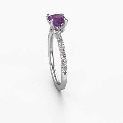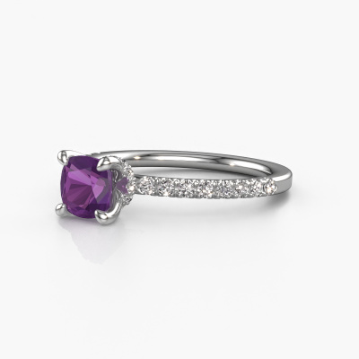 The ring shown above is called the Crystal CUS 4. We call this type of ring a pavé solitaire ring because it has one center gemstone and a band that is also pave set with gemstones. The platinum engagement ring is set with a cushion 5.5 mm amethyst center stone and the band is pave set with diamond gemstones. Each jewel is created to add sparkle to your finger, each jewel is lovingly made by hand by our goldsmiths.This chic platinum pavé solitaire engagement ring has an exquisite cushion amethyst center stone. To further accentuate the center stone, the band is fully set with more diamonds. Its open prong setting allows light to strike the amethyst from various angles and this adds sparkle to your amethyst ring. The photo shown above depicts the goldsmith's carefully handcrafted details of the ring. The high positioning of the center stone is truly eye-catching. The perfect engagement ring for the crown jewel of your life! By using our modern techniques, we can design and customize the finest quality jewels with the utmost care for you. Our engagement rings are always priced 30 percent lower than other jewelers. We make engagement rings to order so we don't have to maintain a large stock. If you have a certain budget, we are more than happy to advice you accordingly.Do you have a specific ring in mind? One you came across somewhere. Please feel free to tell us your wishes and we will turn your design into a unique engagement ring. You can follow the development of your ring design because we use 3D drawings. This gives you a realistic preview of your design. We will gladly send you a non-binding offer, based on a fair price/ quality ratio. It will amaze you.To make it easier for you, we offer a 30 day return policy. Check our terms and conditions.