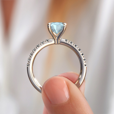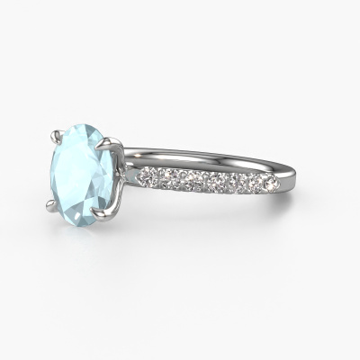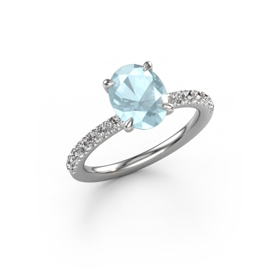 The ring shown above is called the Crystal OVL 2. We call this type of ring a pavé solitaire ring because it has one center gemstone and a band that is also pave set with gemstones. The platinum engagement ring is set with a oval 9x7 mm aquamarine center stone and the band is pave set with lab-grown diamond gemstones. Each jewel is made just for you by our master goldsmiths in our own studio.This exclusive platinum pavé solitaire engagement ring has an exquisite oval aquamarine center stone. To further accentuate the center stone, the band is fully set with more lab grown diamonds. Its open prong setting allows light to strike the aquamarine from various angles and this adds sparkle to your aquamarine ring. The photo shown above depicts the goldsmith's carefully handcrafted details of the ring. The high positioning of the center stone is truly eye-catching. The perfect engagement ring for the crown jewel of your life! By using a combination of the latest modern techniques, combined with ancient crafting, we can make all our engagement rings in our own studio. Each jewel is made to order. This is advantageous because we can offer you a price you won't find anywhere else.Our team adds new designs to our online collection daily. Our designers and goldsmiths work together in creating the best design. We strive to offer a diverse collection of jewels. Perhaps you have a specific jewel design in mind. One you came across somewhere. Please contact us for a free consultation. We will make you an offer, based on a fair price/ quality ratio, that will baffle you.To make it easier for you, we offer a 30 day return policy. Check our terms and conditions.