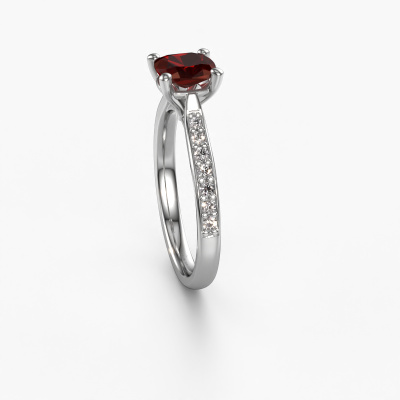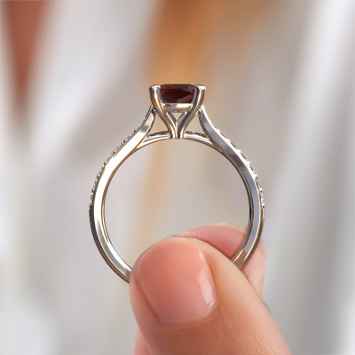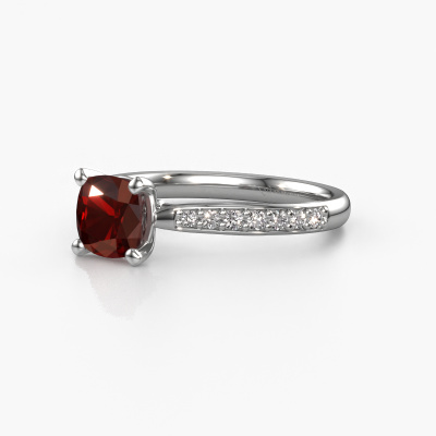 The ring shown above is called the Mignon cus 2. We call this type of ring a pavé solitaire ring because it has one center gemstone and a band that is also pave set with gemstones. The platinum engagement ring is set with a cushion 6 mm garnet center stone and the band is pave set with lab-grown diamond gemstones. Each jewel is made with passion and love by one of our master goldsmiths.This exclusive platinum pavé solitaire engagement ring has an exquisite cushion garnet center stone. To further accentuate the center stone, the band is fully set with more lab grown diamonds. Its open prong setting allows light to strike the garnet from various angles and this adds sparkle to your garnet ring. The photo shown above depicts the goldsmith's carefully handcrafted details of the ring. The high positioning of the center stone is truly eye-catching. The perfect engagement ring for the crown jewel of your life! After receiving your order, our goldsmiths will start the creative process of making your Mignon cus 2 engagement ring. We don't keep stock. This is advantageous because these costs will not be passed on to you. Therefore, we can offer jewelry at exceptionally low prices.Our team adds new designs to our online collection daily. Our designers and goldsmiths work together in creating the best design. We strive to offer a diverse collection of jewels. Perhaps you have a specific jewel design in mind. One you came across somewhere. Please contact us for a free consultation. We will make you an offer, based on a fair price/ quality ratio, that will baffle you.To make it easier for you, we offer a 30 day return policy. Check our terms and conditions.