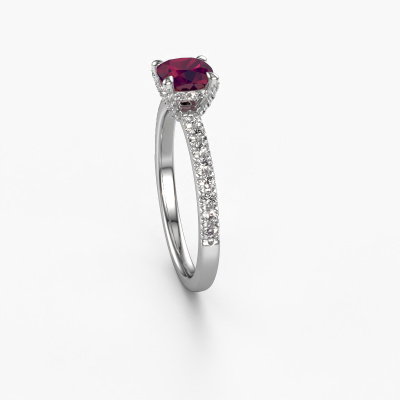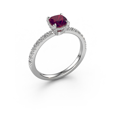The ring shown above is called the Saskia 1 cus. We call this type of ring a pavé solitaire ring because it has one center gemstone and a band that is also pave set with gemstones. The platinum engagement ring is set with a cushion 5.5 mm rhodolite center stone and the band is pave set with diamond gemstones. Each jewel is made by a team of passionate goldsmiths and jewel designers. This will make your crown jewel truly eye-catching.This unique platinum pavé solitaire engagement ring has an exquisite cushion rhodolite center stone. To further accentuate the center stone, the band is fully set with more diamonds. Its open prong setting allows light to strike the rhodolite from various angles and this adds sparkle to your rhodolite ring. The photo shown above depicts the goldsmith's carefully handcrafted details of the ring. The high positioning of the center stone is truly eye-catching. The perfect engagement ring for the crown jewel of your life! By using a combination of the latest modern techniques, combined with ancient crafting, we can make all our engagement rings in our own studio. Each jewel is made to order. This is advantageous because we can offer you a price you won't find anywhere else.Our team adds new designs to our online collection daily. Our designers and goldsmiths work together in creating the best design. We strive to offer a diverse collection of jewels. Perhaps you have a specific jewel design in mind. One you came across somewhere. Please contact us for a free consultation. We will make you an offer, based on a fair price/ quality ratio, that will baffle you.To make it easier for you, we offer a 30 day return policy. Check our terms and conditions.