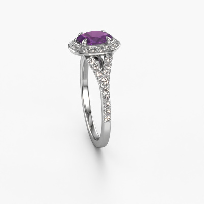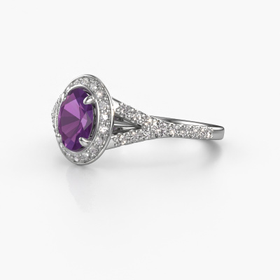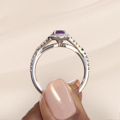 The ring shown above is called the Pamela OVL. We call this type of ring a halo ring because it has one center gemstone and a band that is also pave set with gemstones. The platinum engagement ring is set with a oval 7x5 mm amethyst center stone and the band is pave set with lab grown diamonds. What makes this luxury platinum halo ring special are the smaller sized stones embracing the center stone. This gorgeous engagement ring is called a halo ring because the smaller gemstones give the center stone a halo of surrounding light. In order for the smaller stones to enhance the center stone, they have to be placed so there is no interference of light. And that's when our expert goldsmiths come in. Each individual stone is carefully set in the ring by hand. During manufacturing, light fall is constantly monitored to make sure the special halo is still visible. In the end you get a unique engagement ring, with a amethyst of your choosing at its centre. You can imagine the effect of a ring of such significance when you give it to her on her special day to shine. By using our modern techniques, we can design and customize the finest quality jewels with the utmost care for you. Our engagement rings are always priced 30 percent lower than other jewelers. We make engagement rings to order so we don't have to maintain a large stock. If you have a certain budget, we are more than happy to advice you accordingly.Our team adds new designs to our online collection daily. Our designers and goldsmiths work together in creating the best design. We strive to offer a diverse collection of jewels. Perhaps you have a specific jewel design in mind. One you came across somewhere. Please contact us for a free consultation. We will make you an offer, based on a fair price/ quality ratio, that will baffle you.To make it easier for you, we offer a 30 day return policy. Check our terms and conditions.