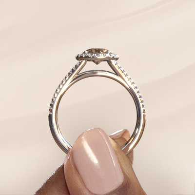 The ring shown above is called the Verla pear 2. We call this type of ring a halo ring because it has one center gemstone and a band that is also pave set with gemstones. The platinum engagement ring is set with a pear 1.00 crt brown diamond center stone and the band is pave set with diamonds. What makes this exclusive platinum halo ring special are the smaller sized stones embracing the center stone. This gorgeous engagement ring is called a halo ring because the smaller gemstones give the center stone a halo of surrounding light. In order for the smaller stones to enhance the center stone, they have to be placed so there is no interference of light. And that's when our expert goldsmiths come in. Each individual stone is carefully set in the ring by hand. During manufacturing, light fall is constantly monitored to make sure the special halo is still visible. In the end you get a unique engagement ring, with a brown diamond of your choosing at its centre. You can imagine the effect of a ring of such significance when you give it to her on her special day to shine. After receiving your order, our goldsmiths will passionately start the creative process of making your engagement ring in our own studio. Because we don't have a big stockpile, these costs will not be passed on to you. Our pricing is proof of that! We offer top quality jewels at lowest price, guaranteed.Our designers and goldsmiths work together each day, creating new jewels. Perhaps you have found a nice exclusive engagement ring somewhere, which can be used to customize your unique ring. Please feel free to contact us. We will make you an offer, based on a fair price/ quality ratio, which will amaze you.To make it easier for you, we offer a 30 day return policy. Check our terms and conditions.