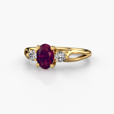 This 14 Carat gold ring is called Amie OVL and is set with 7x5 mm rhodolite. What is it that makes your relationship unique? What is it about her that makes you want to bend down on one knee? The unique bond between the two of you is emphasized by an equally unique ring. A one of a kind stylish 3-stone engagement ring made especially for her. That is why this fantasy ring fits her like a glove. Each specific detail of this stylish gold rhodolite set engagement ring is hand-picked, crafted and polished by our expert goldsmith. The result is an exquisite ring, unique and perfectly crafted to perfection. That is what our expert Goldsmiths strive for. This jewel is made to shine bright around your finger. Each jewel is hand made with love by our goldsmiths.By using our modern techniques, we can design and customize the finest quality jewels with the utmost care for you. Our engagement rings are always priced 30 percent lower than other jewelers. We make engagement rings to order so we don't have to maintain a large stock. If you have a certain budget, we are more than happy to advice you accordingly.Do you have a specific ring in mind? One you came across somewhere. Please feel free to tell us your wishes and we will turn your design into a unique engagement ring. You can follow the development of your ring design because we use 3D drawings. This gives you a realistic preview of your design. We will gladly send you a non-binding offer, based on a fair price/ quality ratio. It will amaze you.To make it easier for you, we offer a 30 day return policy. Check our terms and conditions.