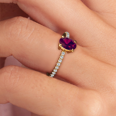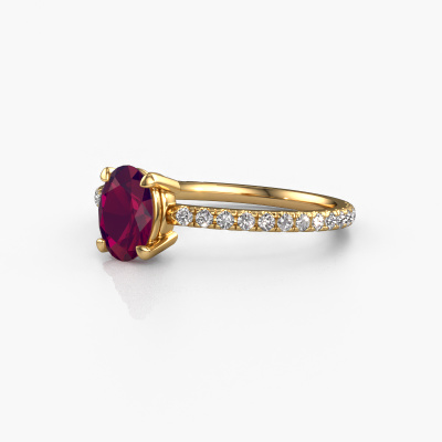 The ring shown above is called the Lynelle 2. We call this type of ring a pavé solitaire ring because it has one center gemstone and a band that is also pave set with gemstones. This engagement ring is made in 14 Carat gold set with a 7x5 mm oval rhodolite, and pave set diamonds at the sides. Each piece of jewelry is created to add sparkle to your finger, each jewel is lovingly made by hand by our goldsmiths.This classic gold pavé solitaire engagement ring has an exquisite oval rhodolite center stone. To further accentuate the center stone, the band is set full with more diamonds. Its open prong setting allows light to strike the rhodolite from various angles and this adds sparkle to your rhodolite ring. The photo shown above depicts the goldsmith's carefully handcrafted details of the ring. The high positioning of the center stone is truly eye-catching. The perfect engagement ring for the crown jewel of your life!After receiving your order, our goldsmiths will start the creative process of making your Lynelle 2 engagement ring. We don't keep stock. This is advantageous because these costs will not be passed on to you. Therefore, we can offer jewelry at exceptionally low prices.Do you have a specific ring in mind? One you came across somewhere. Please feel free to tell us your wishes and we will turn your design into a unique engagement ring. You can follow the development of your ring design because we use 3D drawings. This gives you a realistic preview of your design. We will gladly send you a non-binding offer, based on a fair price/ quality ratio. It will amaze you.To make it easier for you, we offer a 30 day return policy. Check our terms and conditions.