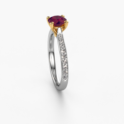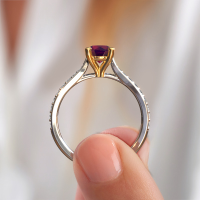 The ring shown above is called the Mignon rnd 2. We call this type of ring a pavé solitaire ring because it has one center gemstone and a band that is also pave set with gemstones. The 14 Carat white gold engagement ring is set with a round 6 mm rhodolite center stone and the band is pave set with lab-grown diamond gemstones. Each jewel is made by a team of passionate goldsmiths and jewel designers. This will make your crown jewel truly eye-catching.This luxury white gold pavé solitaire engagement ring has an exquisite round rhodolite center stone. To further accentuate the center stone, the band is fully set with more lab grown diamonds. Its open prong setting allows light to strike the rhodolite from various angles and this adds sparkle to your rhodolite ring. The photo shown above depicts the goldsmith's carefully handcrafted details of the ring. The high positioning of the center stone is truly eye-catching. The perfect engagement ring for the crown jewel of your life! By using our modern techniques, we can design and customize the finest quality jewels with the utmost care for you. Our engagement rings are always priced 30 percent lower than other jewelers. We make engagement rings to order so we don't have to maintain a large stock. If you have a certain budget, we are more than happy to advice you accordingly.Different styles of new rings are made daily by our team. Perhaps you have found a pavé solitaire engagement ring somewhere. One you would like to give to your loved one. Please feel free to share your thoughts and design with our jewel designers. We would love to turn your design into a luxury engagement ring. You can follow the development of your ring design because we use very detailed 3D drawings. On top of that, you can order a dummy of the design. A dummy is a plastic ring, which can be shaped according your ring design. You can try it on and check if the engagement ring is up to standard. We will gladly send you a non-binding offer, based on a fair price/ quality ratio. The offer will baffle you, considering the quality of the ring and gemstones.To make it easier for you, we offer a 30 day return policy. Check our terms and conditions.