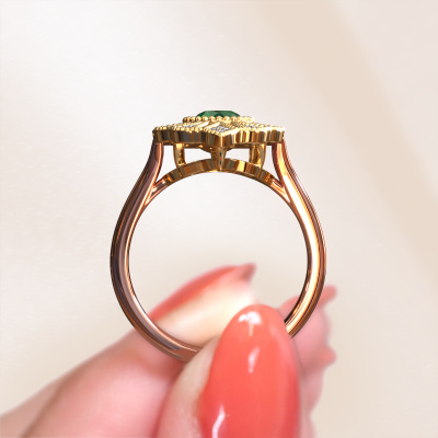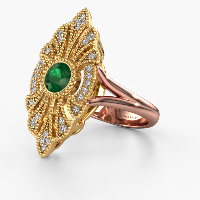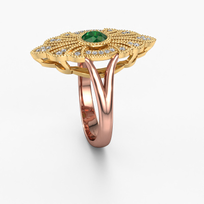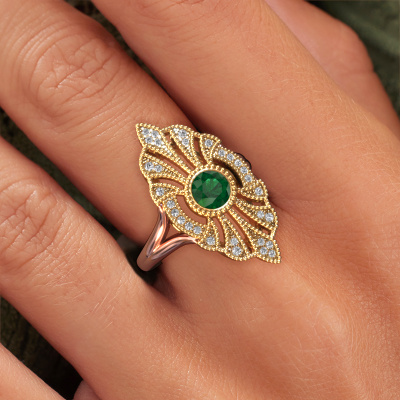 This 14 Carat rose gold ring is called Hanna and is set with 5 mm emerald. This filigree rose gold engagement ring is a true work of art! A beautifully adorned design of intricate wires. With dedication, patience and the utmost precision, our expert goldsmith will design a ring just for you. The adornment of small wiring is crafted to perfection by hand. It's a lengthy process which includes welding, crafting and polishing until our Goldsmiths are completely satisfied with the result: a perfect eye-catching ring that makes her shine with delight. Therefore the vintage filigree engagement ring is an extraordinary gift to bestow upon the love of your life. A handmade one-of-a-kind personalized ring, to be given to that special someone on that special moment when you pop the question. Isn't that wonderful? This piece of jewelry is created to add sparkle to your finger, each jewel is lovingly made by hand by our goldsmiths.After receiving your order, our goldsmiths will passionately start the creative process of making your engagement ring in our own studio. Because we don't have a big stockpile, these costs will not be passed on to you. Our pricing is proof of that! We offer top quality jewels at lowest price, guaranteed.Our team adds new designs to our online collection daily. Our designers and goldsmiths work together in creating the best design. We strive to offer a diverse collection of jewels. Perhaps you have a specific jewel design in mind. One you came across somewhere. Please contact us for a free consultation. We will make you an offer, based on a fair price/ quality ratio, that will baffle you.To make it easier for you, we offer a 30 day return policy. Check our terms and conditions.