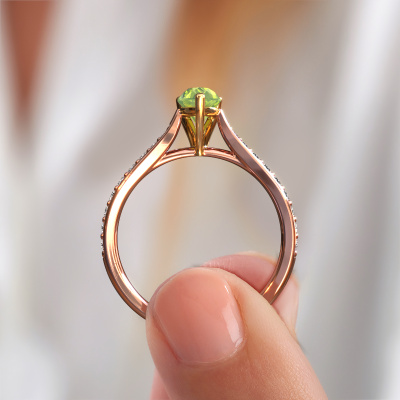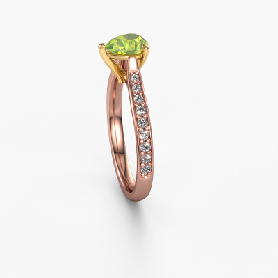The ring shown above is called the Mignon per 2. We call this type of ring a pavé solitaire ring because it has one center gemstone and a band that is also pave set with gemstones. The 14 Carat rose gold engagement ring is set with a pear 6.5x4.5 mm peridot center stone and the band is pave set with diamond gemstones. Each jewel is made just for you by our master goldsmiths in our own studio.This trendy rose gold pavé solitaire engagement ring has an exquisite pear peridot center stone. To further accentuate the center stone, the band is fully set with more diamonds. Its open prong setting allows light to strike the peridot from various angles and this adds sparkle to your peridot ring. The photo shown above depicts the goldsmith's carefully handcrafted details of the ring. The high positioning of the center stone is truly eye-catching. The perfect engagement ring for the crown jewel of your life! Are you on a budget? Please feel free to contact us, so we can go discuss your options. We offer our engagement rings at guaranteed best price, because we make them to order. You won't find such a price anywhere else!Our team adds new designs to our online collection daily. Our designers and goldsmiths work together in creating the best design. We strive to offer a diverse collection of jewels. Perhaps you have a specific jewel design in mind. One you came across somewhere. Please contact us for a free consultation. We will make you an offer, based on a fair price/ quality ratio, that will baffle you.To make it easier for you, we offer a 30 day return policy. Check our terms and conditions.