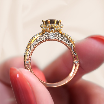 This 14 Carat rose gold ring is called Lysanne and is set with 6.5 mm smokey quartz. This filigree rose gold engagement ring is a true work of art! A beautifully adorned design of intricate wires. With dedication, patience and the utmost precision, our expert goldsmith will design a ring just for you. The adornment of small wiring is crafted to perfection by hand. It's a lengthy process which includes welding, crafting and polishing until our Goldsmiths are completely satisfied with the result: a perfect eye-catching ring that makes her shine with delight. Therefore the vintage filigree engagement ring is an extraordinary gift to bestow upon the love of your life. A handmade one-of-a-kind personalized ring, to be given to that special someone on that special moment when you pop the question. Isn't that wonderful? This piece of jewelry is made by a team of passionate goldsmiths and jewel designers. This will make your crown jewel truly eye-catching.After receiving your order, our goldsmiths will start the creative process of making your Lysanne engagement ring. We don't keep stock. This is advantageous because these costs will not be passed on to you. Therefore, we can offer jewelry at exceptionally low prices.Have you found a specific engagement ring somewhere which you would like to give to your loved one? Please feel free to express your wishes to our jewel designers because we would be honored to turn your design into a vintage engagement ring. You can follow the development of your ring design because we use 3D drawings. This gives you a realistic preview of how your design will look. You can also preorder a dummy. A dummy is a plastic ring, which can be shaped according your ring design. You can try it on and check if its width and size are suitable for you. We will gladly send you a non-binding offer, based on a fair price/ quality ratio. It will amaze you, considering the quality of the ring and gemstones.To make it easier for you, we offer a 30 day return policy. Check our terms and conditions.