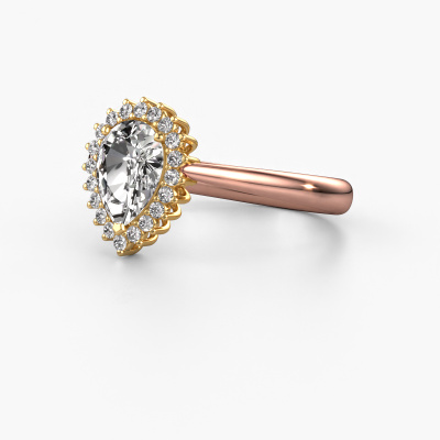 The ring shown above is called the Tilly per 1. We call this type of ring a cluster ring, the center gemstone is surrounded by smaller sized stones. This 14 Carat rose gold version is set with a 1.00 crt pear diamond center stone, embraced by smaller diamonds. The exclusive rose gold cluster engagement ring stands out because of its shape. Together, the smaller and bigger sized diamond gemstones form a flower and they appear to collide into one big sparkling gem. This exclusive engagement ring is also known as the flower ring. Our expert Goldsmiths make sure the smaller diamonds stones are set identically so there is no light interference in the diamond but unity instead. With perfect precision and a skillful hand each diamond is set in the ring. During manufacturing, it is constantly monitored to make sure light reflects flawlessly. This results in a unique engagement ring, with a radiant diamond at its centre. A lovely, meaningful gift to bestow upon the love of your life. After receiving your order, our goldsmiths will start the creative process of making your Tilly per 1 engagement ring. We don't keep stock. This is advantageous because these costs will not be passed on to you. Therefore, we can offer jewelry at exceptionally low prices.Our team adds new designs to our online collection daily. Our designers and goldsmiths work together in creating the best design. We strive to offer a diverse collection of jewels. Perhaps you have a specific jewel design in mind. One you came across somewhere. Please contact us for a free consultation. We will make you an offer, based on a fair price/ quality ratio, that will baffle you.To make it easier for you, we offer a 30 day return policy. Check our terms and conditions.