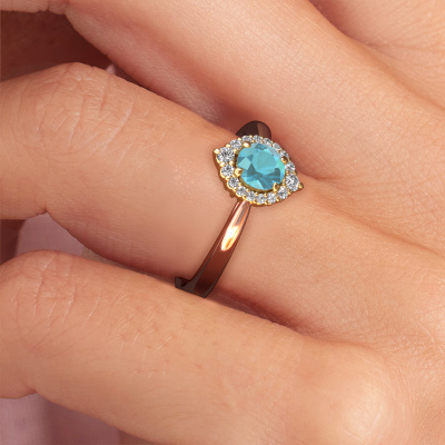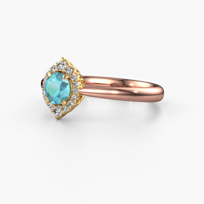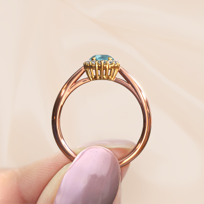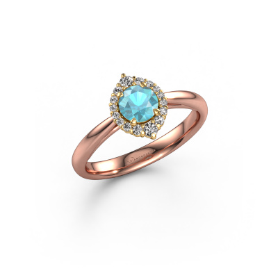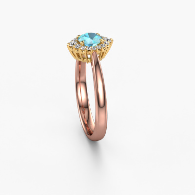 The ring shown above is called the Tora. We call this type of ring a cluster ring, the center gemstone is surrounded by smaller sized stones. This 14 Carat rose gold version is set with a 5 mm round blue topaz center stone, embraced by smaller lab grown diamonds. The classic rose gold cluster engagement ring stands out because of its shape. Together, the smaller and bigger sized blue topaz gemstones form a flower and they appear to collide into one big sparkling gem. This classic engagement ring is also known as the flower ring. Our expert Goldsmiths make sure the smaller lab grown diamonds stones are set identically so there is no light interference in the blue topaz but unity instead. With perfect precision and a skillful hand each blue topaz is set in the ring. During manufacturing, it is constantly monitored to make sure light reflects flawlessly. This results in a unique engagement ring, with a radiant blue topaz at its centre. A lovely, meaningful gift to bestow upon the love of your life. By using a combination of the latest modern techniques, combined with ancient crafting, we can make all our engagement rings in our own studio. Each jewel is made to order. This is advantageous because we can offer you a price you won't find anywhere else.Have you found a specific engagement ring somewhere which you would like to give to your loved one? Please feel free to express your wishes to our jewel designers because we would be honored to turn your design into a classic engagement ring. You can follow the development of your ring design because we use 3D drawings. This gives you a realistic preview of how your design will look. You can also preorder a dummy. A dummy is a plastic ring, which can be shaped according your ring design. You can try it on and check if its width and size are suitable for you. We will gladly send you a non-binding offer, based on a fair price/ quality ratio. It will amaze you, considering the quality of the ring and gemstones.To make it easier for you, we offer a 30 day return policy. Check our terms and conditions.