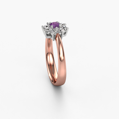 The ring shown above is called the Camille 1. We call this type of ring a cluster ring, the center gemstone is surrounded by smaller sized stones. This 14 Carat rose gold version is set with a 3.4 mm round amethyst center stone, embraced by smaller diamonds. The traditional rose gold cluster engagement ring stands out because of its shape. Together, the smaller and bigger sized amethyst gemstones form a flower and they appear to collide into one big sparkling gem. This traditional engagement ring is also known as the flower ring. Our expert Goldsmiths make sure the smaller diamonds stones are set identically so there is no light interference in the amethyst but unity instead. With perfect precision and a skillful hand each amethyst is set in the ring. During manufacturing, it is constantly monitored to make sure light reflects flawlessly. This results in a unique engagement ring, with a radiant amethyst at its centre. A lovely, meaningful gift to bestow upon the love of your life. By using our modern techniques, we can design and customize the finest quality jewels with the utmost care for you. Our engagement rings are always priced 30 percent lower than other jewelers. We make engagement rings to order so we don't have to maintain a large stock. If you have a certain budget, we are more than happy to advice you accordingly.Our team adds new designs to our online collection daily. Our designers and goldsmiths work together in creating the best design. We strive to offer a diverse collection of jewels. Perhaps you have a specific jewel design in mind. One you came across somewhere. Please contact us for a free consultation. We will make you an offer, based on a fair price/ quality ratio, that will baffle you.To make it easier for you, we offer a 30 day return policy. Check our terms and conditions.