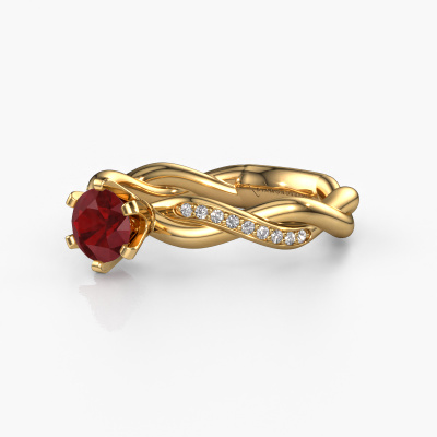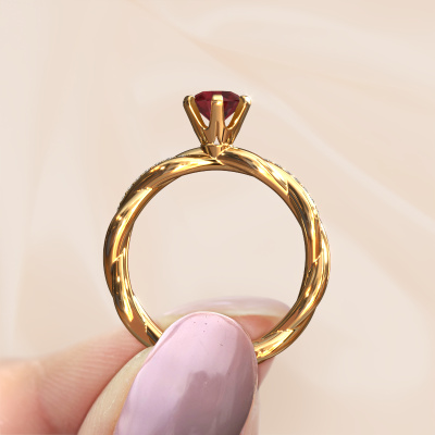 In your eyes, no one else compares to her. She is one in a million, unlike anyone else and pure? These qualities are emphasized perfectly by our fantasy gold solitaire ruby ring. This ruby is carefully selected by our keen artisan goldsmiths. It equals the unique qualities of the love of your life. There is no better way to memorialize your proposal than this symbol of true love. The ring shown above is called the Page, we call this a solitaire ring because it contains a single gemstone. The engagement ring is made in 14 Carat gold and has a round ruby of 5.4 mm. Each piece of jewelry is made with passion and love by one of our master goldsmiths.Are you on a budget? Please feel free to contact us, so we can go discuss your options. We offer our engagement rings at guaranteed best price, because we make them to order. You won't find such a price anywhere else!Do you have a specific ring in mind? One you came across somewhere. Please feel free to tell us your wishes and we will turn your design into a unique engagement ring. You can follow the development of your ring design because we use 3D drawings. This gives you a realistic preview of your design. We will gladly send you a non-binding offer, based on a fair price/ quality ratio. It will amaze you.To make it easier for you, we offer a 30 day return policy. Check our terms and conditions.