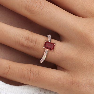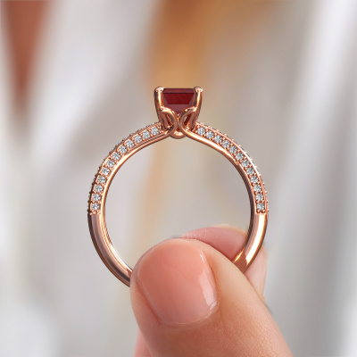 The ring shown above is called the Elenore eme. We call this type of ring a pavé solitaire ring because it has one center gemstone and a band that is also pave set with gemstones. This engagement ring is made in 14 Carat rose gold set with a 7x5 mm emerald cut ruby, and pave set lab grown diamonds at the sides. Each piece of jewelry is made just for you, with attention to detail and design.This exclusive rose gold pavé solitaire engagement ring has an exquisite emerald cut ruby center stone. To further accentuate the center stone, the band is set full with more lab grown diamonds. Its open prong setting allows light to strike the ruby from various angles and this adds sparkle to your ruby ring. The photo shown above depicts the goldsmith's carefully handcrafted details of the ring. The high positioning of the center stone is truly eye-catching. The perfect engagement ring for the crown jewel of your life!Are you on a budget? Please feel free to contact us, so we can go discuss your options. We offer our engagement rings at guaranteed best price, because we make them to order. You won't find such a price anywhere else!Have you found a specific engagement ring somewhere which you would like to give to your loved one? Please feel free to express your wishes to our jewel designers because we would be honored to turn your design into a exclusive engagement ring. You can follow the development of your ring design because we use 3D drawings. This gives you a realistic preview of how your design will look. You can also preorder a dummy. A dummy is a plastic ring, which can be shaped according your ring design. You can try it on and check if its width and size are suitable for you. We will gladly send you a non-binding offer, based on a fair price/ quality ratio. It will amaze you, considering the quality of the ring and gemstones.To make it easier for you, we offer a 30 day return policy. Check our terms and conditions.