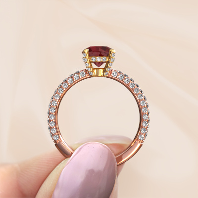 The ring shown above is called the Saskia rnd 2. We call this type of ring a pavé solitaire ring because it has one center gemstone and a band that is also pave set with gemstones. The 14 Carat rose gold engagement ring is set with a round 7 mm ruby center stone and the band is pave set with lab-grown diamond gemstones. Each jewel is made by a team of passionate goldsmiths and jewel designers. This will make your crown jewel truly eye-catching.This exclusive rose gold pavé solitaire engagement ring has an exquisite round ruby center stone. To further accentuate the center stone, the band is fully set with more lab grown diamonds. Its open prong setting allows light to strike the ruby from various angles and this adds sparkle to your ruby ring. The photo shown above depicts the goldsmith's carefully handcrafted details of the ring. The high positioning of the center stone is truly eye-catching. The perfect engagement ring for the crown jewel of your life! After receiving your order, our goldsmiths will passionately start the creative process of making your engagement ring in our own studio. Because we don't have a big stockpile, these costs will not be passed on to you. Our pricing is proof of that! We offer top quality jewels at lowest price, guaranteed.Our team adds new designs to our online collection daily. Our designers and goldsmiths work together in creating the best design. We strive to offer a diverse collection of jewels. Perhaps you have a specific jewel design in mind. One you came across somewhere. Please contact us for a free consultation. We will make you an offer, based on a fair price/ quality ratio, that will baffle you.To make it easier for you, we offer a 30 day return policy. Check our terms and conditions.