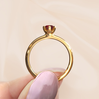 In your eyes, no one else compares to her. She is one in a million, unlike anyone else and pure? These qualities are emphasized perfectly by our modern gold solitaire ruby ring. This ruby is carefully selected by our keen artisan goldsmiths. It equals the unique qualities of the love of your life. There is no better way to memorialize your proposal than this symbol of true love. The ring shown above is called the Lorretta, we call this a solitaire ring because it contains a single gemstone. The engagement ring is made in 14 Carat gold and has a round ruby of 4.7 mm. Each piece of jewelry is made with passion and love by one of our master goldsmiths.By using a combination of the latest modern techniques, combined with ancient crafting, we can make all our engagement rings in our own studio. Each jewel is made to order. This is advantageous because we can offer you a price you won't find anywhere else.Our team adds new designs to our online collection daily. Our designers and goldsmiths work together in creating the best design. We strive to offer a diverse collection of jewels. Perhaps you have a specific jewel design in mind. One you came across somewhere. Please contact us for a free consultation. We will make you an offer, based on a fair price/ quality ratio, that will baffle you.To make it easier for you, we offer a 30 day return policy. Check our terms and conditions.