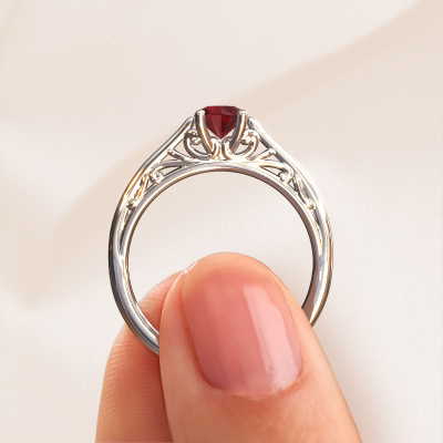 This platinum ring is called Shannon rnd and is set with ruby. How would you describe the style of the love of your life? Does she have a unique sense of style? This stunning ajour platinum engagement ring can be custom made to your own or her liking. Our ruby gemstones have been carefully selected because we believe your fantasy engagement ring must be adorned with nothing but the most beautiful gemstone. Don't you agree? This jewel is made with passion and love by one of our master goldsmiths.By using a combination of the latest modern techniques, combined with ancient crafting, we can make all our engagement rings in our own studio. Each jewel is made to order. This is advantageous because we can offer you a price you won't find anywhere else.Do you have a specific ring in mind? One you came across somewhere. Please feel free to tell us your wishes and we will turn your design into a unique engagement ring. You can follow the development of your ring design because we use 3D drawings. This gives you a realistic preview of your design. We will gladly send you a non-binding offer, based on a fair price/ quality ratio. It will amaze you.To make it easier for you, we offer a 30 day return policy. Check our terms and conditions.