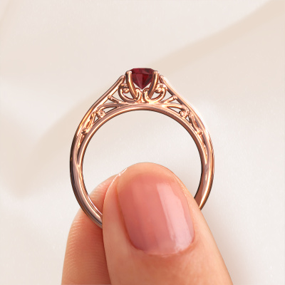 This 14 Carat rose gold ring is called Shannon rnd and is set with ruby. How would you describe the style of the love of your life? Does she have a unique sense of style? This stunning ajour rose gold engagement ring can be custom made to your own or her liking. Our ruby gemstones have been carefully selected because we believe your fantasy engagement ring must be adorned with nothing but the most beautiful gemstone. Don't you agree? This jewel is made with passion and love by one of our master goldsmiths.By using a combination of the latest modern techniques, combined with ancient crafting, we can make all our engagement rings in our own studio. Each jewel is made to order. This is advantageous because we can offer you a price you won't find anywhere else.Do you have a specific ring in mind? One you came across somewhere. Please feel free to tell us your wishes and we will turn your design into a unique engagement ring. You can follow the development of your ring design because we use 3D drawings. This gives you a realistic preview of your design. We will gladly send you a non-binding offer, based on a fair price/ quality ratio. It will amaze you.To make it easier for you, we offer a 30 day return policy. Check our terms and conditions.