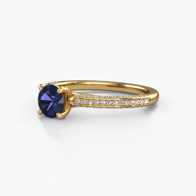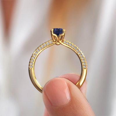 The ring shown above is called the Elenore rnd. We call this type of ring a pavé solitaire ring because it has one center gemstone and a band that is also pave set with gemstones. This engagement ring is made in 14 Carat gold set with a 5.4 mm round sapphire, and pave set lab grown diamonds at the sides. Each piece of jewelry is made just for you by our master goldsmiths in our own studio.This exclusive gold pavé solitaire engagement ring has an exquisite round sapphire center stone. To further accentuate the center stone, the band is set full with more lab grown diamonds. Its open prong setting allows light to strike the sapphire from various angles and this adds sparkle to your sapphire ring. The photo shown above depicts the goldsmith's carefully handcrafted details of the ring. The high positioning of the center stone is truly eye-catching. The perfect engagement ring for the crown jewel of your life!By using a combination of the latest modern techniques, combined with ancient crafting, we can make all our engagement rings in our own studio. Each jewel is made to order. This is advantageous because we can offer you a price you won't find anywhere else.Have you found a specific engagement ring somewhere which you would like to give to your loved one? Please feel free to express your wishes to our jewel designers because we would be honored to turn your design into a exclusive engagement ring. You can follow the development of your ring design because we use 3D drawings. This gives you a realistic preview of how your design will look. You can also preorder a dummy. A dummy is a plastic ring, which can be shaped according your ring design. You can try it on and check if its width and size are suitable for you. We will gladly send you a non-binding offer, based on a fair price/ quality ratio. It will amaze you, considering the quality of the ring and gemstones.To make it easier for you, we offer a 30 day return policy. Check our terms and conditions.