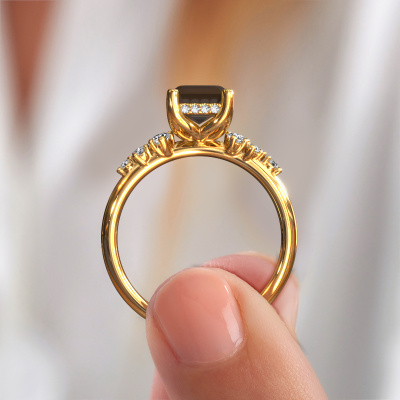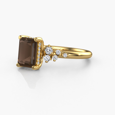 The ring shown above is called the Emma EME. We call this type of ring a pavé solitaire ring because it has one center gemstone and a band that is also pave set with gemstones. This engagement ring is made in 14 Carat gold set with a 8x6 mm emerald cut smokey quartz, and pave set lab grown diamonds at the sides. Each piece of jewelry is made with passion and love by one of our master goldsmiths.This fantasy gold pavé solitaire engagement ring has an exquisite emerald cut smokey quartz center stone. To further accentuate the center stone, the band is set full with more lab grown diamonds. Its open prong setting allows light to strike the smokey quartz from various angles and this adds sparkle to your smokey quartz ring. The photo shown above depicts the goldsmith's carefully handcrafted details of the ring. The high positioning of the center stone is truly eye-catching. The perfect engagement ring for the crown jewel of your life!After receiving your order, our goldsmiths will passionately start the creative process of making your engagement ring in our own studio. Because we don't have a big stockpile, these costs will not be passed on to you. Our pricing is proof of that! We offer top quality jewels at lowest price, guaranteed.Our team adds new designs to our online collection daily. Our designers and goldsmiths work together in creating the best design. We strive to offer a diverse collection of jewels. Perhaps you have a specific jewel design in mind. One you came across somewhere. Please contact us for a free consultation. We will make you an offer, based on a fair price/ quality ratio, that will baffle you.To make it easier for you, we offer a 30 day return policy. Check our terms and conditions.