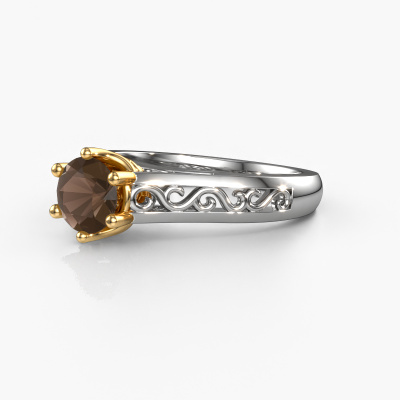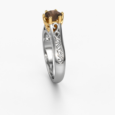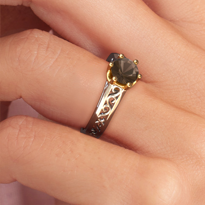 The ring shown above is called the Shan, we call this a solitaire ring because it contains a single gemstone. The engagement ring is made in 14 Carat white gold and has a round smokey quartz of 6 mm. The cool thing about our configurator is that you can compile your own piece of jewelry, into a completely personalized one. This solitaire ring is crafted in the precious metals white gold with gold, but of course you are free to pick your own colors. Each piece of jewelry is made by a team of passionate goldsmiths and jewel designers. This will make your crown jewel truly eye-catching.The solitaire ring is a special type of engagement ring. Its open prong setting allows light to strike the gemstone from various angles. This Celtic engagement ring is a stunning eye-catcher because of the high positioning of the gemstone. In order for you to commemorate your proposal with a unique ring, we carefully adorn this solitaire ring by hand. The love of your life deserves nothing but the best. By using our modern techniques, we can design and customize the finest quality jewels with the utmost care for you. Our engagement rings are always priced 30 percent lower than other jewelers. We make engagement rings to order so we don't have to maintain a large stock. If you have a certain budget, we are more than happy to advice you accordingly.Have you found a specific engagement ring somewhere which you would like to give to your loved one? Please feel free to express your wishes to our jewel designers because we would be honored to turn your design into a Celtic engagement ring. You can follow the development of your ring design because we use 3D drawings. This gives you a realistic preview of how your design will look. You can also preorder a dummy. A dummy is a plastic ring, which can be shaped according your ring design. You can try it on and check if its width and size are suitable for you. We will gladly send you a non-binding offer, based on a fair price/ quality ratio. It will amaze you, considering the quality of the ring and gemstones.To make it easier for you, we offer a 30 day return policy. Check our terms and conditions.