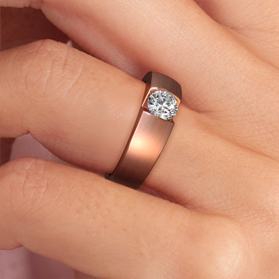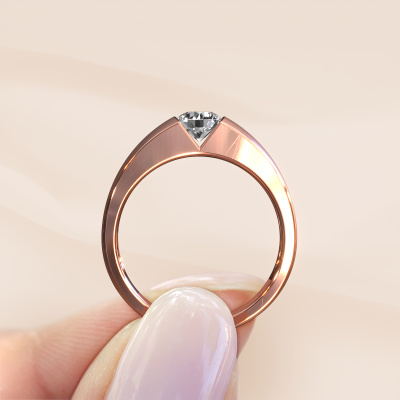 This 14 Carat rose gold ring is called Theresia and is set with 0.50 crt diamond. The tension setting is what makes this a special engagement ring because it emphasizes the diamond. Our expert goldsmith uses special techniques to set the diamond in this rose gold ring. By using these techniques, light reflects freely. This gives the ring its maximum shine and a glamorous appearance. A true work of art! The result is a unique ring, with a trendy appearance, passionately handcrafted to perfection by our expert goldsmith. A one-of-a-kind ring, designed for the love of your life. We recommend a solid gemstone, such as a diamond or sapphire, if you select this ring. The ring must be able to endure a lot of pressure during manufacturing. This piece of jewelry is made just for you by our master goldsmiths in our own studio.By using our modern techniques, we can design and customize the finest quality jewels with the utmost care for you. Our engagement rings are always priced 30 percent lower than other jewelers. We make engagement rings to order so we don't have to maintain a large stock. If you have a certain budget, we are more than happy to advice you accordingly.Different styles of new rings are made daily by our team. Perhaps you have found a solitaire engagement ring somewhere. One you would like to give to your loved one. Please feel free to share your thoughts and design with our jewel designers. We would love to turn your design into a modern engagement ring. You can follow the development of your ring design because we use very detailed 3D drawings. On top of that, you can order a dummy of the design. A dummy is a plastic ring, which can be shaped according your ring design. You can try it on and check if the engagement ring is up to standard. We will gladly send you a non-binding offer, based on a fair price/ quality ratio. The offer will baffle you, considering the quality of the ring and gemstones.To make it easier for you, we offer a 30 day return policy. Check our terms and conditions.
