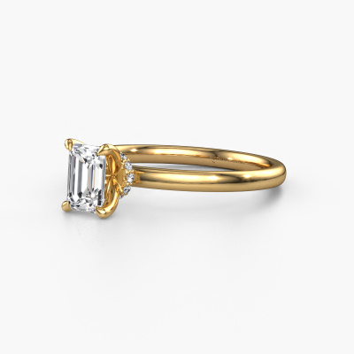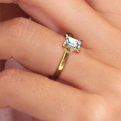 The ring shown above is called the Crystal EME 3, we call this a solitaire ring because it contains a single gemstone. The engagement ring is made in 14 Carat gold and has a emerald cut lab-grown diamond of 0.70 crt. This classic gold solitaire ring with exquisite emerald cut lab-grown diamond is a beautiful engagement ring. The open prong setting allows light to strike the gemstone from various angles. The ring also stands out because of the high positioning of the gemstone. Because diamonds symbolize true love and purity, they make the perfect gift for the love of your life. The symbol of eternal love is the centerpiece of this solitaire ring. Like a diamond, all other types of precious metal have their own attributed symbolic meaning. You can compile the solitaire engagement ring yourself in various precious metal combinations. This one has the combination of 14 Carat gold with gold. Each piece of jewelry is made by a team of passionate goldsmiths and jewel designers. This will make your crown jewel truly eye-catching.By using our modern techniques, we can design and customize the finest quality jewels with the utmost care for you. Our engagement rings are always priced 30 percent lower than other jewelers. We make engagement rings to order so we don't have to maintain a large stock. If you have a certain budget, we are more than happy to advice you accordingly.Do you have a specific ring in mind? One you came across somewhere. Please feel free to tell us your wishes and we will turn your design into a unique engagement ring. You can follow the development of your ring design because we use 3D drawings. This gives you a realistic preview of your design. We will gladly send you a non-binding offer, based on a fair price/ quality ratio. It will amaze you.To make it easier for you, we offer a 30 day return policy. Check our terms and conditions.