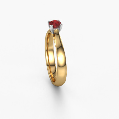 The ring shown above is called the Sam, we call this a solitaire ring because it contains a single gemstone. The engagement ring is made in 14 Carat gold and has a round ruby of 4.2 mm. This classic gold solitaire ring with exquisite round ruby is a beautiful engagement ring. The open prong setting allows light to strike the gemstone from various angles. The ring also stands out because of the high positioning of the gemstone. Because diamonds symbolize true love and purity, they make the perfect gift for the love of your life. The symbol of eternal love is the centerpiece of this solitaire ring. Like a diamond, all other types of precious metal have their own attributed symbolic meaning. You can compile the solitaire engagement ring yourself in various precious metal combinations. This one has the combination of 14 Carat gold with white gold. Each piece of jewelry is made just for you, with attention to detail and design.After receiving your order, our goldsmiths will passionately start the creative process of making your engagement ring in our own studio. Because we don't have a big stockpile, these costs will not be passed on to you. Our pricing is proof of that! We offer top quality jewels at lowest price, guaranteed.Our team adds new designs to our online collection daily. Our designers and goldsmiths work together in creating the best design. We strive to offer a diverse collection of jewels. Perhaps you have a specific jewel design in mind. One you came across somewhere. Please contact us for a free consultation. We will make you an offer, based on a fair price/ quality ratio, that will baffle you.To make it easier for you, we offer a 30 day return policy. Check our terms and conditions.