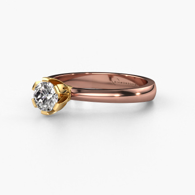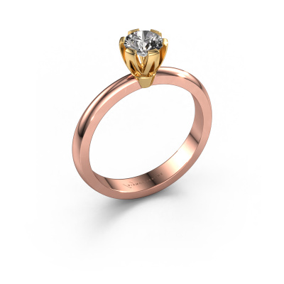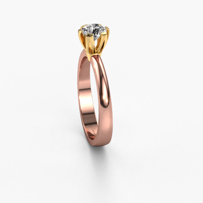The ring shown above is called the Julia, we call this a solitaire ring because it contains a single gemstone. The engagement ring is made in 14 Carat rose gold and has a round diamond of 0.40 crt. This trendy rose gold solitaire ring with exquisite round diamond is a beautiful engagement ring. The open prong setting allows light to strike the gemstone from various angles. The ring also stands out because of the high positioning of the gemstone. Because diamonds symbolize true love and purity, they make the perfect gift for the love of your life. The symbol of eternal love is the centerpiece of this solitaire ring. Like a diamond, all other types of precious metal have their own attributed symbolic meaning. You can compile the solitaire engagement ring yourself in various precious metal combinations. This one has the combination of 14 Carat rose gold with gold. Each piece of jewelry is created to add sparkle to your finger, each jewel is lovingly made by hand by our goldsmiths.Are you on a budget? Please feel free to contact us, so we can go discuss your options. We offer our engagement rings at guaranteed best price, because we make them to order. You won't find such a price anywhere else!Different styles of new rings are made daily by our team. Perhaps you have found a solitaire engagement ring somewhere. One you would like to give to your loved one. Please feel free to share your thoughts and design with our jewel designers. We would love to turn your design into a trendy engagement ring. You can follow the development of your ring design because we use very detailed 3D drawings. On top of that, you can order a dummy of the design. A dummy is a plastic ring, which can be shaped according your ring design. You can try it on and check if the engagement ring is up to standard. We will gladly send you a non-binding offer, based on a fair price/ quality ratio. The offer will baffle you, considering the quality of the ring and gemstones.To make it easier for you, we offer a 30 day return policy. Check our terms and conditions.
