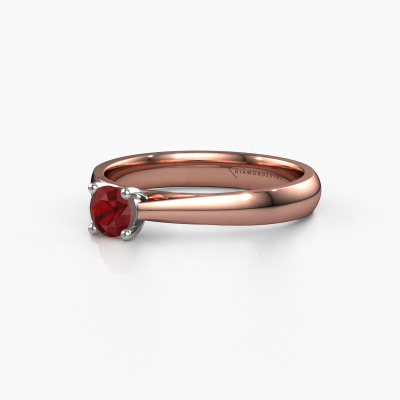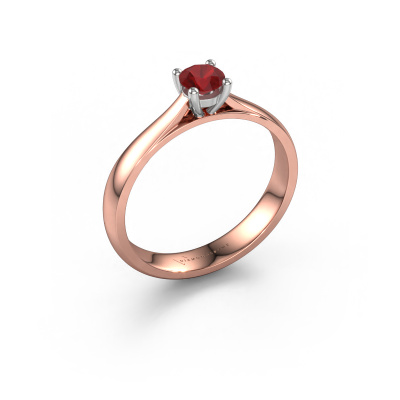 The ring shown above is called the Sam, we call this a solitaire ring because it contains a single gemstone. The engagement ring is made in 14 Carat rose gold and has a round ruby of 4.2 mm. This classic rose gold solitaire ring with exquisite round ruby is a beautiful engagement ring. The open prong setting allows light to strike the gemstone from various angles. The ring also stands out because of the high positioning of the gemstone. Because diamonds symbolize true love and purity, they make the perfect gift for the love of your life. The symbol of eternal love is the centerpiece of this solitaire ring. Like a diamond, all other types of precious metal have their own attributed symbolic meaning. You can compile the solitaire engagement ring yourself in various precious metal combinations. This one has the combination of 14 Carat rose gold with white gold. Each piece of jewelry is made just for you, with attention to detail and design.After receiving your order, our goldsmiths will passionately start the creative process of making your engagement ring in our own studio. Because we don't have a big stockpile, these costs will not be passed on to you. Our pricing is proof of that! We offer top quality jewels at lowest price, guaranteed.Our team adds new designs to our online collection daily. Our designers and goldsmiths work together in creating the best design. We strive to offer a diverse collection of jewels. Perhaps you have a specific jewel design in mind. One you came across somewhere. Please contact us for a free consultation. We will make you an offer, based on a fair price/ quality ratio, that will baffle you.To make it easier for you, we offer a 30 day return policy. Check our terms and conditions.