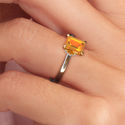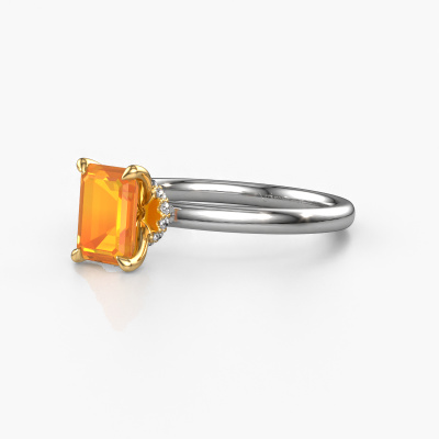 The ring shown above is called the Crystal EME 3, we call this a solitaire ring because it contains a single gemstone. The engagement ring is made in 14 Carat white gold and has a emerald cut citrin of 7x5 mm. This classic white gold solitaire ring with exquisite emerald cut citrin is a beautiful engagement ring. The open prong setting allows light to strike the gemstone from various angles. The ring also stands out because of the high positioning of the gemstone. Because diamonds symbolize true love and purity, they make the perfect gift for the love of your life. The symbol of eternal love is the centerpiece of this solitaire ring. Like a diamond, all other types of precious metal have their own attributed symbolic meaning. You can compile the solitaire engagement ring yourself in various precious metal combinations. This one has the combination of 14 Carat white gold with gold. Each piece of jewelry is made by a team of passionate goldsmiths and jewel designers. This will make your crown jewel truly eye-catching.By using our modern techniques, we can design and customize the finest quality jewels with the utmost care for you. Our engagement rings are always priced 30 percent lower than other jewelers. We make engagement rings to order so we don't have to maintain a large stock. If you have a certain budget, we are more than happy to advice you accordingly.Do you have a specific ring in mind? One you came across somewhere. Please feel free to tell us your wishes and we will turn your design into a unique engagement ring. You can follow the development of your ring design because we use 3D drawings. This gives you a realistic preview of your design. We will gladly send you a non-binding offer, based on a fair price/ quality ratio. It will amaze you.To make it easier for you, we offer a 30 day return policy. Check our terms and conditions.