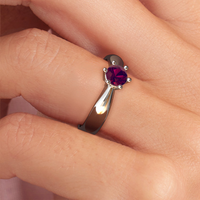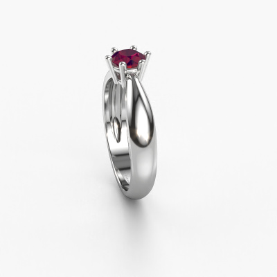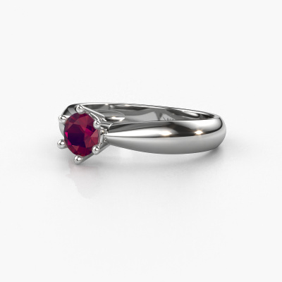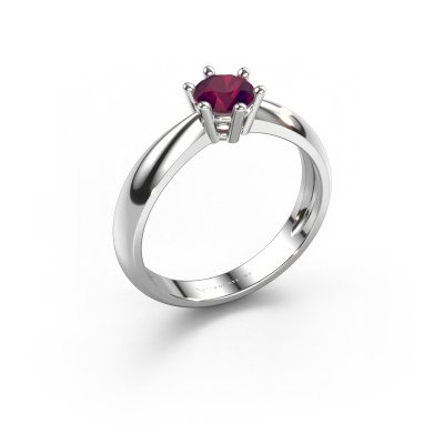 The ring shown above is called the Fay, we call this a solitaire ring because it contains a single gemstone. The engagement ring is made in 14 Carat white gold and has a round rhodolite of 5 mm. This traditional white gold solitaire ring with exquisite round rhodolite is a beautiful engagement ring. The open prong setting allows light to strike the gemstone from various angles. The ring also stands out because of the high positioning of the gemstone. Because diamonds symbolize true love and purity, they make the perfect gift for the love of your life. The symbol of eternal love is the centerpiece of this solitaire ring. Like a diamond, all other types of precious metal have their own attributed symbolic meaning. You can compile the solitaire engagement ring yourself in various precious metal combinations. This one has the combination of 14 Carat white gold with white gold. Each piece of jewelry is made just for you by our master goldsmiths in our own studio.By using a combination of the latest modern techniques, combined with ancient crafting, we can make all our engagement rings in our own studio. Each jewel is made to order. This is advantageous because we can offer you a price you won't find anywhere else.Have you found a specific engagement ring somewhere which you would like to give to your loved one? Please feel free to express your wishes to our jewel designers because we would be honored to turn your design into a traditional engagement ring. You can follow the development of your ring design because we use 3D drawings. This gives you a realistic preview of how your design will look. You can also preorder a dummy. A dummy is a plastic ring, which can be shaped according your ring design. You can try it on and check if its width and size are suitable for you. We will gladly send you a non-binding offer, based on a fair price/ quality ratio. It will amaze you, considering the quality of the ring and gemstones.To make it easier for you, we offer a 30 day return policy. Check our terms and conditions.