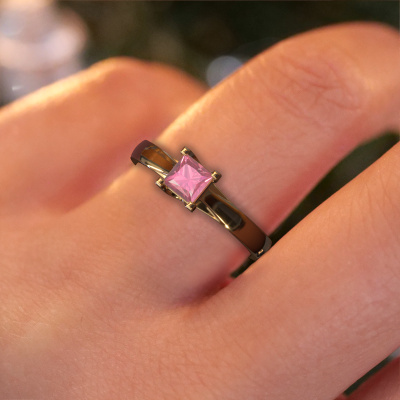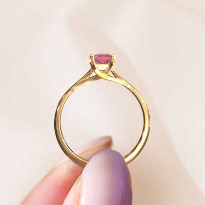 The ring shown above is called the Mia Square, we call this a solitaire ring because it contains a single gemstone. The engagement ring is made in 14 Carat gold and has a princess tourmaline pink of 4 mm. The cool thing about our configurator is that you can compile your own piece of jewelry, into a completely personalized one. This solitaire ring is crafted in the precious metals gold with gold, but of course you are free to pick your own colors. Each piece of jewelry is made by a team of passionate goldsmiths and jewel designers. This will make your crown jewel truly eye-catching.The solitaire ring is a special type of engagement ring. Its open prong setting allows light to strike the gemstone from various angles. This modern engagement ring is a stunning eye-catcher because of the high positioning of the gemstone. In order for you to commemorate your proposal with a unique ring, we carefully adorn this solitaire ring by hand. The love of your life deserves nothing but the best. By using our modern techniques, we can design and customize the finest quality jewels with the utmost care for you. Our engagement rings are always priced 30 percent lower than other jewelers. We make engagement rings to order so we don't have to maintain a large stock. If you have a certain budget, we are more than happy to advice you accordingly.Have you found a specific engagement ring somewhere which you would like to give to your loved one? Please feel free to express your wishes to our jewel designers because we would be honored to turn your design into a modern engagement ring. You can follow the development of your ring design because we use 3D drawings. This gives you a realistic preview of how your design will look. You can also preorder a dummy. A dummy is a plastic ring, which can be shaped according your ring design. You can try it on and check if its width and size are suitable for you. We will gladly send you a non-binding offer, based on a fair price/ quality ratio. It will amaze you, considering the quality of the ring and gemstones.To make it easier for you, we offer a 30 day return policy. Check our terms and conditions.