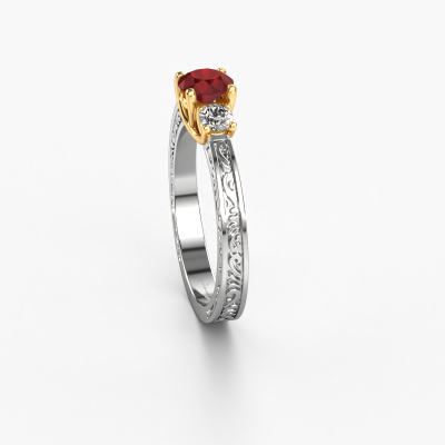 This 14 Carat white gold ring is called Betty 1 and is set with ruby. An extraordinary white gold vintage ring. One that will surely make the love of your life shine like a diamond! That is what we hope to achieve. This Celtic engagement ring is set with exquisite ruby. Whichever gemstone you choose from our selection, is up to you. The gemstone is selected with great care because we believe your engagement ring must be adorned with nothing but the most beautiful gemstone. Wouldn't you agree? Our expert goldsmith will design your ring in our own artisan studio, where the ruby will be set with great precision. The ring will then be polished till it is absolutely perfect. Nothing but the best for the love of your life! This jewel is created to add sparkle to your finger, each jewel is lovingly made by hand by our goldsmiths.Are you on a budget? Please feel free to contact us, so we can go discuss your options. We offer our engagement rings at guaranteed best price, because we make them to order. You won't find such a price anywhere else!Our team adds new designs to our online collection daily. Our designers and goldsmiths work together in creating the best design. We strive to offer a diverse collection of jewels. Perhaps you have a specific jewel design in mind. One you came across somewhere. Please contact us for a free consultation. We will make you an offer, based on a fair price/ quality ratio, that will baffle you.To make it easier for you, we offer a 30 day return policy. Check our terms and conditions.