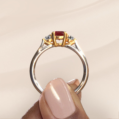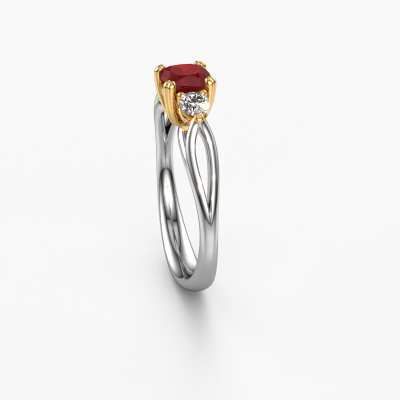 This 14 Carat white gold ring is called Amie cus and is set with 5 mm ruby. Does your girlfriend fancy exclusive jewelry? Or would you like to show her that she deserves the finest jewelry? This white gold ring is pure craftsmanship, love and passion combined with the latest techniques coming together in perfect harmony. It requires a keen eye, patience and a skillful hand to mold this ring into perfection. Just the job for our expert goldsmith! The ruby set gemstones gives this white gold ring an extra glamorous appearance. Customize the style of the ajour engagement ring to her liking with a wide variety of precious metals and gemstones which you select. That is how you create a unique ring for the most exclusive woman in your life! This jewel is made just for you, with attention to detail and design.After receiving your order, our goldsmiths will passionately start the creative process of making your engagement ring in our own studio. Because we don't have a big stockpile, these costs will not be passed on to you. Our pricing is proof of that! We offer top quality jewels at lowest price, guaranteed.Have you found a specific engagement ring somewhere which you would like to give to your loved one? Please feel free to express your wishes to our jewel designers because we would be honored to turn your design into a fantasy engagement ring. You can follow the development of your ring design because we use 3D drawings. This gives you a realistic preview of how your design will look. You can also preorder a dummy. A dummy is a plastic ring, which can be shaped according your ring design. You can try it on and check if its width and size are suitable for you. We will gladly send you a non-binding offer, based on a fair price/ quality ratio. It will amaze you, considering the quality of the ring and gemstones.To make it easier for you, we offer a 30 day return policy. Check our terms and conditions.