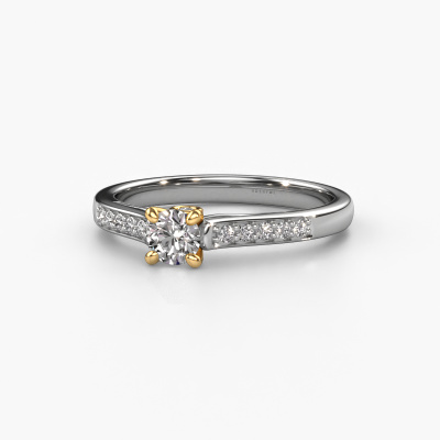 The ring shown above is called the Valorie RND 2. We call this type of ring a pavé solitaire ring because it has one center gemstone and a band that is also pave set with gemstones. The 14 Carat white gold engagement ring is set with a round 0.30 crt diamond center stone and the band is pave set with lab-grown diamond gemstones. Each jewel is made just for you, with attention to detail and design.This modern white gold pavé solitaire engagement ring has an exquisite round diamond center stone. To further accentuate the center stone, the band is fully set with more lab grown diamonds. Its open prong setting allows light to strike the diamond from various angles and this adds sparkle to your diamond ring. The photo shown above depicts the goldsmith's carefully handcrafted details of the ring. The high positioning of the center stone is truly eye-catching. The perfect engagement ring for the crown jewel of your life! By using our modern techniques, we can design and customize the finest quality jewels with the utmost care for you. Our engagement rings are always priced 30 percent lower than other jewelers. We make engagement rings to order so we don't have to maintain a large stock. If you have a certain budget, we are more than happy to advice you accordingly.Our designers and goldsmiths work together each day, creating new jewels. Perhaps you have found a nice modern engagement ring somewhere, which can be used to customize your unique ring. Please feel free to contact us. We will make you an offer, based on a fair price/ quality ratio, which will amaze you.To make it easier for you, we offer a 30 day return policy. Check our terms and conditions.