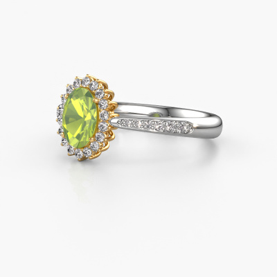 The ring shown above is called the Tilly ovl 2. We call this type of ring a cluster ring, the center gemstone is surrounded by smaller sized stones. This 14 Carat white gold version is set with a 7x5 mm oval peridot center stone, embraced by smaller lab grown diamonds. If you look at this white gold cluster engagement ring, you might get the impression that its smaller sized stones collide with the bigger peridot, so it is shaped like a flower. Therefore this engagement ring is also known as the flower ring. Our artisan goldsmiths get the job done. Each individual stone is carefully set by hand. During manufacturing, light fall is constantly monitored to make sure the special cluster effect is still visible. In the end you get the perfect engagement ring with a radiant peridot gemstone centerpiece. You can imagine the effect of a ring of such significance when you give tot the love of your life on her special day to shine. By using our modern techniques, we can design and customize the finest quality jewels with the utmost care for you. Our engagement rings are always priced 30 percent lower than other jewelers. We make engagement rings to order so we don't have to maintain a large stock. If you have a certain budget, we are more than happy to advice you accordingly.Different styles of new rings are made daily by our team. Perhaps you have found a cluster engagement ring somewhere. One you would like to give to your loved one. Please feel free to share your thoughts and design with our jewel designers. We would love to turn your design into a classic engagement ring. You can follow the development of your ring design because we use very detailed 3D drawings. On top of that, you can order a dummy of the design. A dummy is a plastic ring, which can be shaped according your ring design. You can try it on and check if the engagement ring is up to standard. We will gladly send you a non-binding offer, based on a fair price/ quality ratio. The offer will baffle you, considering the quality of the ring and gemstones.To make it easier for you, we offer a 30 day return policy. Check our terms and conditions.