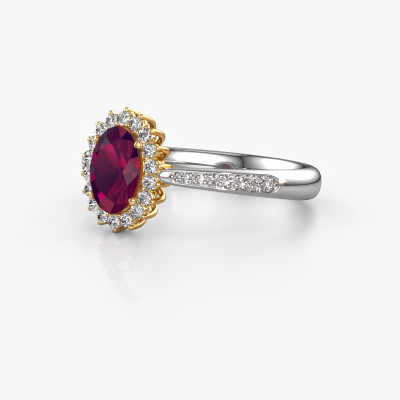 The ring shown above is called the Tilly ovl 2. We call this type of ring a cluster ring, the center gemstone is surrounded by smaller sized stones. This 14 Carat white gold version is set with a 7x5 mm oval rhodolite center stone, embraced by smaller lab grown diamonds. If you look at this white gold cluster engagement ring, you might get the impression that its smaller sized stones collide with the bigger rhodolite, so it is shaped like a flower. Therefore this engagement ring is also known as the flower ring. Our artisan goldsmiths get the job done. Each individual stone is carefully set by hand. During manufacturing, light fall is constantly monitored to make sure the special cluster effect is still visible. In the end you get the perfect engagement ring with a radiant rhodolite gemstone centerpiece. You can imagine the effect of a ring of such significance when you give tot the love of your life on her special day to shine. By using our modern techniques, we can design and customize the finest quality jewels with the utmost care for you. Our engagement rings are always priced 30 percent lower than other jewelers. We make engagement rings to order so we don't have to maintain a large stock. If you have a certain budget, we are more than happy to advice you accordingly.Different styles of new rings are made daily by our team. Perhaps you have found a cluster engagement ring somewhere. One you would like to give to your loved one. Please feel free to share your thoughts and design with our jewel designers. We would love to turn your design into a classic engagement ring. You can follow the development of your ring design because we use very detailed 3D drawings. On top of that, you can order a dummy of the design. A dummy is a plastic ring, which can be shaped according your ring design. You can try it on and check if the engagement ring is up to standard. We will gladly send you a non-binding offer, based on a fair price/ quality ratio. The offer will baffle you, considering the quality of the ring and gemstones.To make it easier for you, we offer a 30 day return policy. Check our terms and conditions.