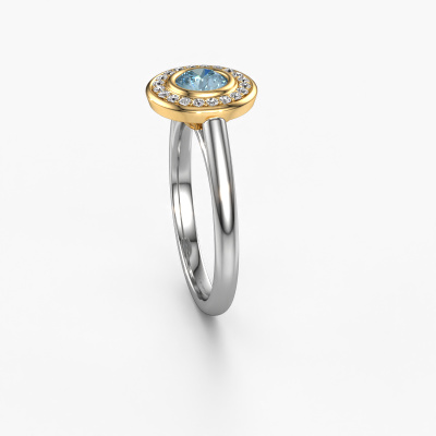 The ring shown above is called the Noud 1 RND. We call this type of ring a halo ring because it has one center gemstone and a band that is also pave set with gemstones. The 14 Carat white gold promise ring is set with a round 4.7 mm blue lab grown diamond center stone and the band is pave set with diamonds. What makes this traditional white gold halo ring special are the smaller sized stones embracing the center stone. This gorgeous promise ring is called a halo ring because the smaller gemstones give the center stone a halo of surrounding light. In order for the smaller stones to enhance the center stone, they have to be placed so there is no interference of light. And that's when our expert goldsmiths come in. Each individual stone is carefully set in the ring by hand. During manufacturing, light fall is constantly monitored to make sure the special halo is still visible. In the end you get a unique promise ring, with a blue lab grown diamond of your choosing at its centre. You can imagine the effect of a ring of such significance when you give it to her on her special day to shine.