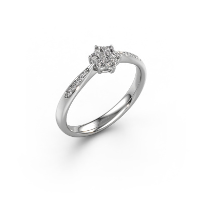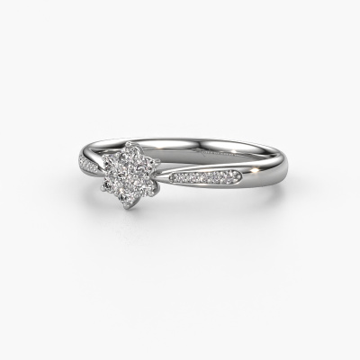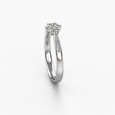 The ring shown above is called the Chantal 2. We call this type of ring a cluster ring, the center gemstone is surrounded by smaller sized stones. This 14 Carat white gold version is set with a 1.7 mm round zirconia center stone, embraced by smaller lab grown diamonds. If you look at this white gold cluster engagement ring, you might get the impression that its smaller sized stones collide with the bigger zirconia, so it is shaped like a flower. Therefore this engagement ring is also known as the flower ring. Our artisan goldsmiths get the job done. Each individual stone is carefully set by hand. During manufacturing, light fall is constantly monitored to make sure the special cluster effect is still visible. In the end you get the perfect engagement ring with a radiant zirconia gemstone centerpiece. You can imagine the effect of a ring of such significance when you give tot the love of your life on her special day to shine. After receiving your order, our goldsmiths will passionately start the creative process of making your engagement ring in our own studio. Because we don't have a big stockpile, these costs will not be passed on to you. Our pricing is proof of that! We offer top quality jewels at lowest price, guaranteed.Have you found a specific engagement ring somewhere which you would like to give to your loved one? Please feel free to express your wishes to our jewel designers because we would be honored to turn your design into a traditional engagement ring. You can follow the development of your ring design because we use 3D drawings. This gives you a realistic preview of how your design will look. You can also preorder a dummy. A dummy is a plastic ring, which can be shaped according your ring design. You can try it on and check if its width and size are suitable for you. We will gladly send you a non-binding offer, based on a fair price/ quality ratio. It will amaze you, considering the quality of the ring and gemstones.To make it easier for you, we offer a 30 day return policy. Check our terms and conditions.