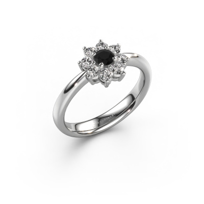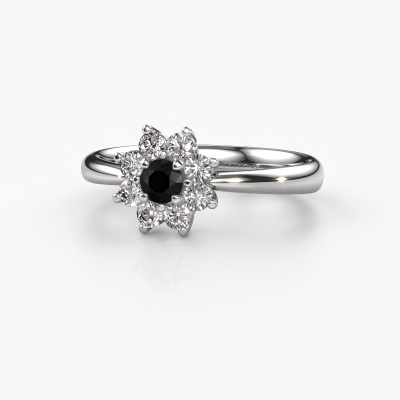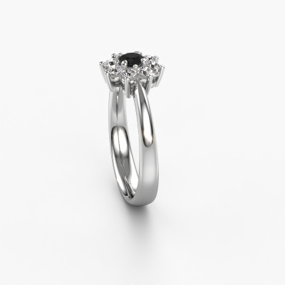 The ring shown above is called the Camille 1. We call this type of ring a cluster ring, the center gemstone is surrounded by smaller sized stones. This 14 Carat white gold version is set with a 0.18 crt round black diamond center stone, embraced by smaller diamonds. The traditional white gold cluster engagement ring stands out because of its shape. Together, the smaller and bigger sized black diamond gemstones form a flower and they appear to collide into one big sparkling gem. This traditional engagement ring is also known as the flower ring. Our expert Goldsmiths make sure the smaller diamonds stones are set identically so there is no light interference in the black diamond but unity instead. With perfect precision and a skillful hand each black diamond is set in the ring. During manufacturing, it is constantly monitored to make sure light reflects flawlessly. This results in a unique engagement ring, with a radiant black diamond at its centre. A lovely, meaningful gift to bestow upon the love of your life. By using our modern techniques, we can design and customize the finest quality jewels with the utmost care for you. Our engagement rings are always priced 30 percent lower than other jewelers. We make engagement rings to order so we don't have to maintain a large stock. If you have a certain budget, we are more than happy to advice you accordingly.Our team adds new designs to our online collection daily. Our designers and goldsmiths work together in creating the best design. We strive to offer a diverse collection of jewels. Perhaps you have a specific jewel design in mind. One you came across somewhere. Please contact us for a free consultation. We will make you an offer, based on a fair price/ quality ratio, that will baffle you.To make it easier for you, we offer a 30 day return policy. Check our terms and conditions.