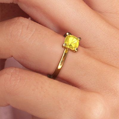 The ring shown above is called the Crystal CUS 1, we call this a solitaire ring because it contains a single gemstone. The engagement ring is made in 14 Carat gold and has a cushion yellow sapphire of 5.5 mm. The cool thing about our configurator is that you can compile your own piece of jewelry, into a completely personalized one. This solitaire ring is crafted in the precious metals gold with gold, but of course you are free to pick your own colors. Each piece of jewelry is made with passion and love by one of our master goldsmiths.The solitaire ring is a special type of engagement ring. Its open prong setting allows light to strike the gemstone from various angles. This contemporary engagement ring is a stunning eye-catcher because of the high positioning of the gemstone. In order for you to commemorate your proposal with a unique ring, we carefully adorn this solitaire ring by hand. The love of your life deserves nothing but the best. Because we design and deliver our own rings, we can offer you a engagement ring at a price you won't find anywhere else. A ring is made to order, which helps prevent excess supplies, so we can make you a great price offer. We understand it feels risky, buying your engagement ring online, but we will gladly assist in the designing process, taking your budget into consideration.Our team adds new designs to our online collection daily. Our designers and goldsmiths work together in creating the best design. We strive to offer a diverse collection of jewels. Perhaps you have a specific jewel design in mind. One you came across somewhere. Please contact us for a free consultation. We will make you an offer, based on a fair price/ quality ratio, that will baffle you.To make it easier for you, we offer a 30 day return policy. Check our terms and conditions.