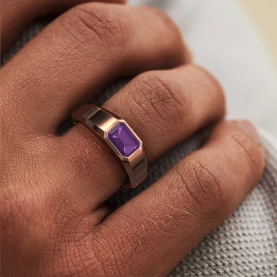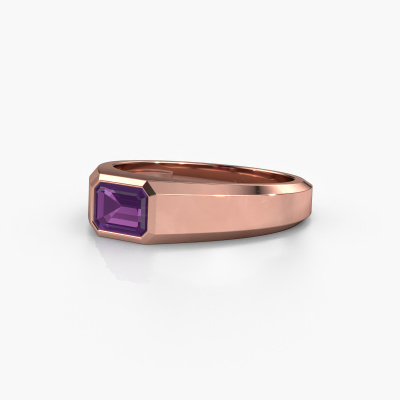 Are you looking for a exclusive rose gold men's ring that is slightly different? Then our rectangular rose gold amethyst set Dylan 1 men's ring is the perfect ring for you! This ring, as shown here, is made of rose gold but feel free to customize to your liking. Show them what you are all about with this rose gold amethysten Dylan 1 men's ring, a ring for ambitious men. Our goldsmiths passionately create your customized men's ring to your liking with the utmost care. The rose gold men's ring, as shown here, can be customized using our online tool. Feel free to ask our jewel designers for assistance if you want changes made which are unavailable in our online tool. We are happy to answer your questions.Our team of talented, passionate designers add new ring designs to our online collection daily. Our objective in doing so, is to be able to offer you a wide variety of jewels. Please feel free to request a quote if you have specific wishes for your ring. We guarantee to make you an offer you can't refuse.By using a combination of the latest modern techniques, combined with ancient crafting, we can make all our rings in our own studio. Each jewel is made to order. This is advantageous because we can offer you a price you won't find anywhere else.To make it easier for you, we offer a 30 day return policy. Check our terms and conditions.